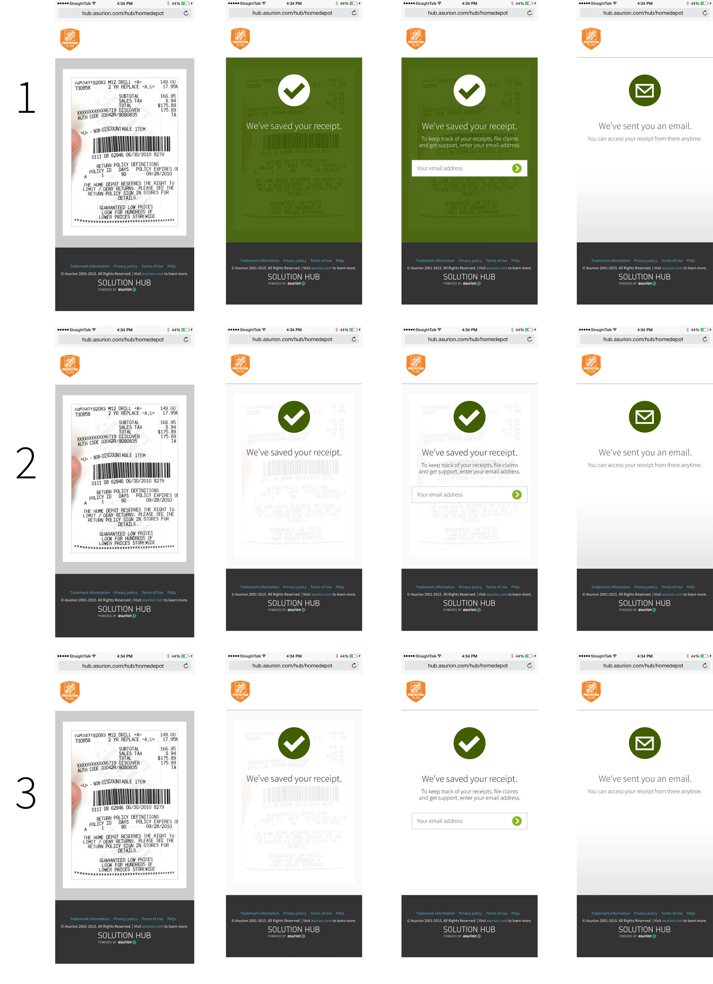 This process allows users to register before they even leave the parking lot with their major purchases. There were a handful of differences between the original use case and the Home Depot use case. I collaborated with our technology partners to ensure they had what they needed, and with our clients. I specifically focused on animations between screens and visual design for this project, as the experience of texting to register had been thoroughly tested with previous clients.
